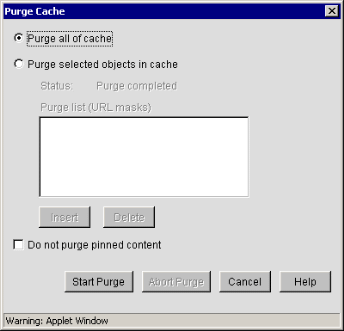 You can remove all cached objects from the appliance's cache, or you can perform a limited purging of cached objects based on URL masks. Purging cannot be undone.