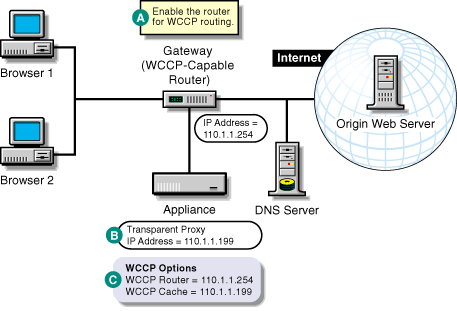 See A in Figure 15. A WCCP-capable router can service more than one transparent proxy server. |