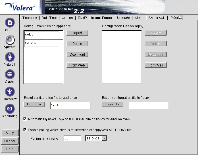The Import/Export tab lets you manage appliance configuration files on the appliance and on floppy diskettes.