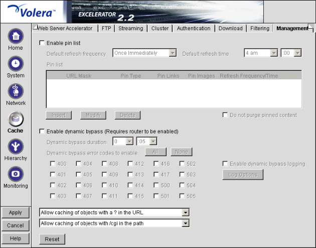 The Management tab lets you identify objects that will be either pinned (explicitly downloaded and retained in cache as long as possible) or bypassed (explicitly not cached when requested by users). It also lets you specify how pinned objects are stored on the appliance (pin type).