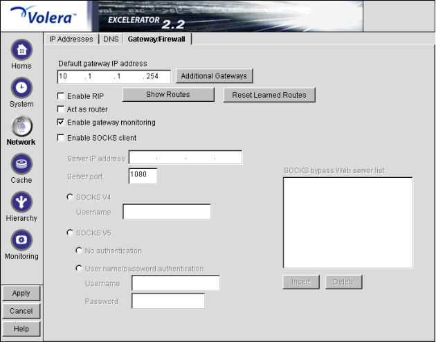 Enable SOCKS Client: SOCKS is a firewall communication protocol. If a firewall prevents the appliance from communicating directly, you can specify information for SOCKS4 or SOCKS5 servers.