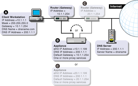 The workstation of each browser that will use appliance proxy services must be configured with the IP address information listed below. (List items marked with asterisks [*] must be on the same subnet.)
