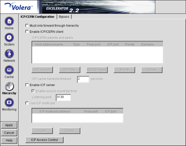 Enable ICP Server: Enables the appliance to be accessed as an ICP parent or ICP peer by other appliances in an ICP hierarchy. (A CERN parent is simply a forward proxy serving a second forward proxy [its child] and requires no special configuration.)