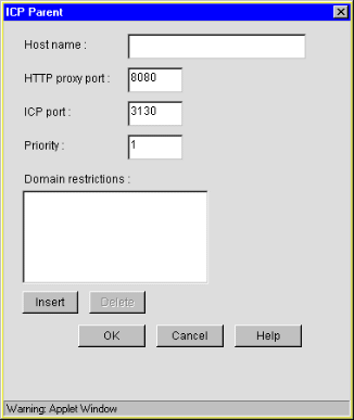 Domain Restrictions: Determines whether the appliance requests data through this ICP parent. If the request is to one of the domains in this list, the client considers this parent when selecting a server. If the requested domain is not listed, this parent is not considered.
