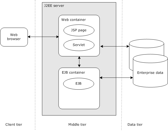 The application server supports a three-tiered architecture that consists of a client tier, a middle tier, and a data tier.