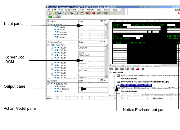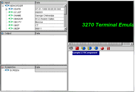 There are two key differences, however. The first is that the 3270 Component Editor also includes a Native Environment pane common to all Connects. It contains a 3270 or emulator and appears black until you select the Record or connect button in the 3270 Component Editor window. Pressing the Record button establishes a 3270 emulation session inside the Native Environment pane with the host specified in the connection used by the 3270 component. The second difference is the addition of a panel containing only an XML DOM called ScreenDoc to the component editor window. This DOM presents an XML document representation of each screen received from the host and is available for reference and creating mapping actions within the component, and is available in the expression builder, allowing the user to easily reference a screen field. For those who want to create a quick HTML representation of the 3270 screen, they can use the output of the ScreenDoc DOM and apply a style sheet to create an HTML representation of the screen.