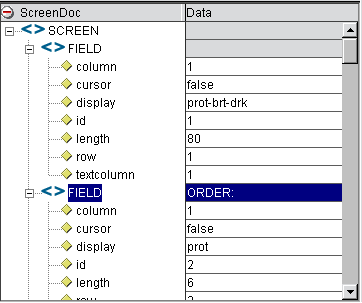 Each field in the TDS is represented in the ScreenDoc DOM as an element titled FIELD. The ScreenDoc DOM contains as many FIELD elements as there are fields in the TDS. The element displays any data defined for the field. Note that screen fields are used for both field labels and data-entry fields.