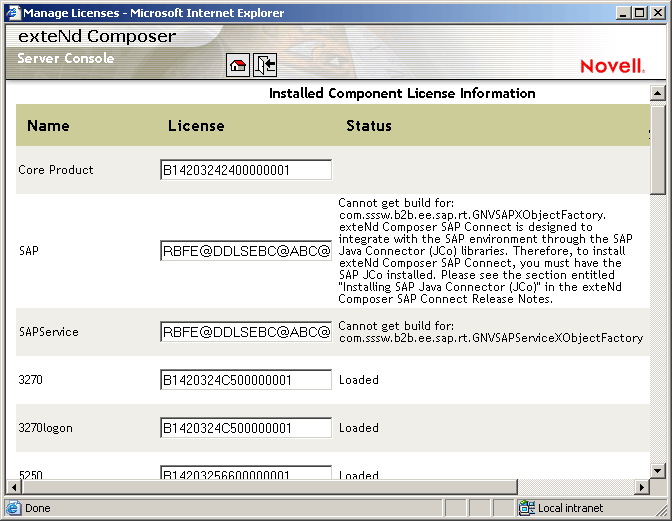 This page gives a detailed listing of license information, including Status info that may be useful for troubleshooting. In the above picture, for example, the entry for SAP Connect has a detailed status message explaining why the connector did not load. Likewise, the entry for SAP Service contains a message mentioning a specific class name. Again, you may be asked for this information when contacting Customer Support.