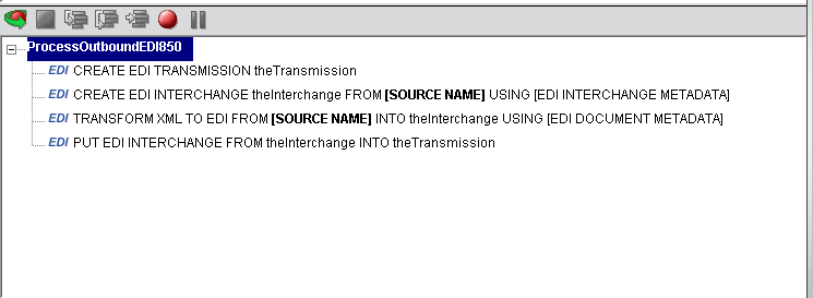 In creating an outbound EDI Transmission, you will typically start with the transmission data in XML format. Before you can transform an EDI Document in XML format to its EDI Document representation, you must create an Interchange object to contain the EDI Document. The purpose of the Create EDI Interchange action, is to create an interchange object into which you can subsequently insert EDI Documents. To create an interchange, you must supply a name for it, a Source XPath identifying where to find the Interchange data, and an Interchange Metadata that identifies the EDI Standard (i.e. ANSIX.12 or EDIFACT) you wish to create. In determining the Interchange Resource, you can specify an ECMAScript expression that queries other sources of data to conditionally apply the appropriate standard.