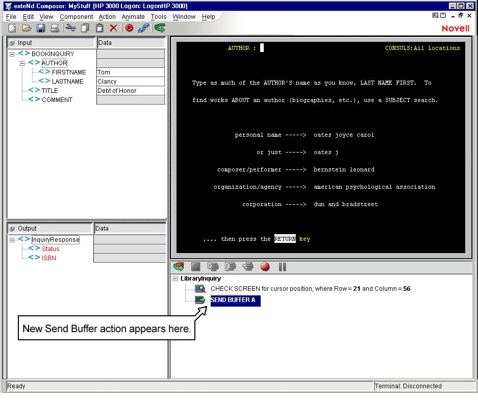 The easiest way to create an Action Model for your component is to use Record mode. When you build an Action Model in this way, a new Send Buffer action is created for you automatically as soon as you begin typing or drag an element from the Input DOM into the appropriate field onscreen. All you need then do is wait for the next screen to arrive from the host, add a Check Screen action to make sure you are on the right screen and begin the process again, repeatedly. In this fashion, a sequence of Check Screens, Send Buffers and Check Screens can be built very quickly and naturally.