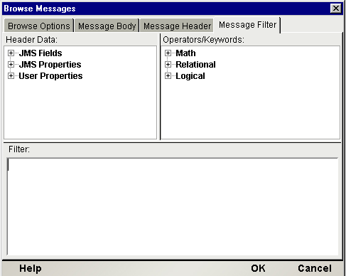 If you want to apply a JMS Message Filter to your Browse operation, enter it (and/or build it using the picklist items) in the text area in the lower half of the dialog. (See "Working with Message Filters (Selectors)" on page 94 for more information.)