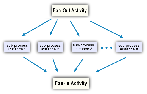 The Fan-Out Activity, on receiving a batch of work, unbundles the work items and spawns multiple instances of the appropriate target subprocess: one instance per work item. The subprocess might be called something like "DetermineQuantityOnHand" and the batch might be a collection of SKU numbers. One instance of DetermineQuantityOnHand is created for each SKU number.