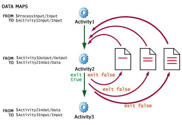 Activity2 has an input message named Activity2InOut and an output message of the same name. If Activity2 exits with an exit condition of false, it reexecutes using Activity2InOut. But Activity2InOut's data was modified on the initial execution of the activity as part of a loop. (Perhaps new info from a database lookup was appended to the Data doc.) In any case, the exit condition on Activity2 might be an XPath expression that inspects a flag value in the output DOM. The flag value would signal the need either to iterate again or break out of the loop.