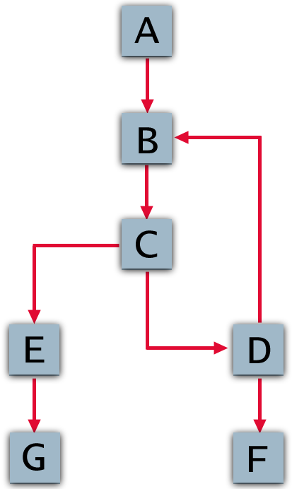 The reason looping is not allowed in a process model is that it opens the door to any number of ill-defined situations that would be difficult to manage. For example, consider the control-flow graph shown below, which has a loop-link from D back to B. The runtime engine must make some difficult decisions: