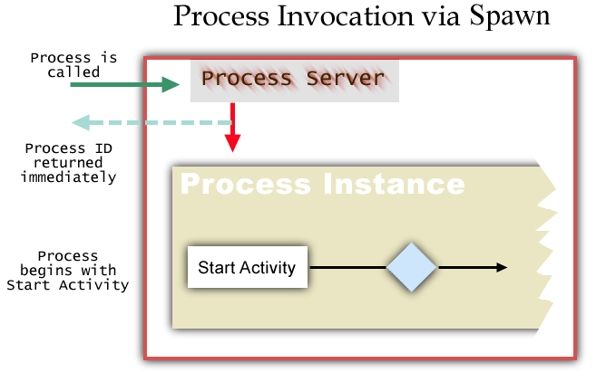 The following graphic shows typical process-startup mechanics for a process instance that has been invoked via spawn. (That is, the caller has elected to invoke the process in a "fire and forget" manner.)