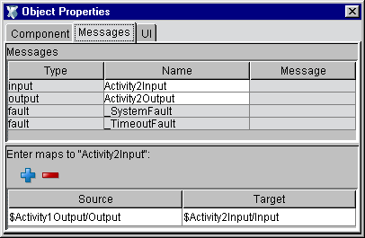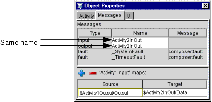 The top part of this panel shows the process-specific name for the activity's input and output messages as well as the concrete Type and Message descriptions given in the WSDL for the service (i.e., the activity's implementation). In other words, the Type and Message fields are automatically filled out with values taken from the WSDL portType segment.