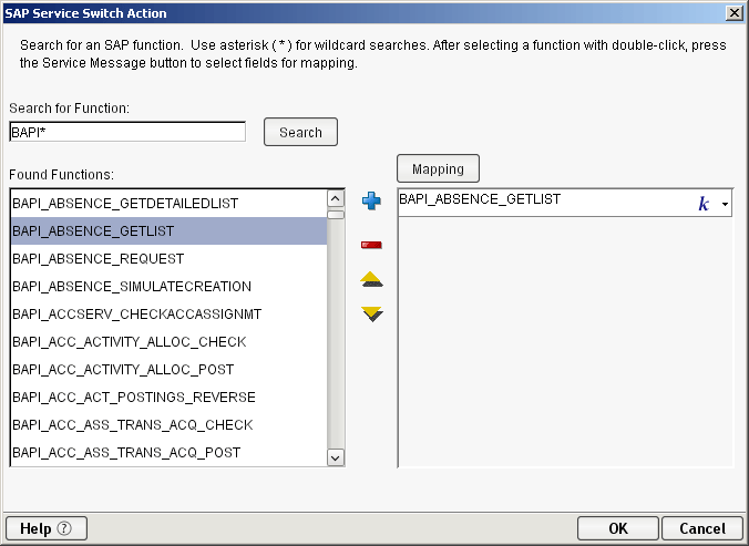 Use the Found Functions picklist on the left to designate function names that will be handled by your service. Transfer selected names under Found Functions to the list on the right by using the plus-sign icon. Use the minus-sign icon to remove names from the list on the right. (Use up and down arrows to reorder the chosen names.) Names on the right will become the basis of "case" blocks in your SAP Service Switch action.