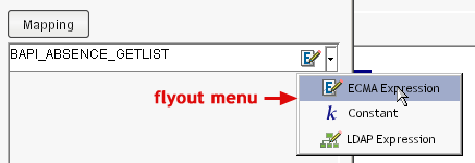 NOTE: You may optionally enter (by hand), in the right-hand list, the name(s) of functions you know will be handled by your service. You can also use the flyout menu on the right edge of the Mapping list to bring up buttons that will let you determine the mapped value programmatically, using ECMAScript, or by LDAP lookup.