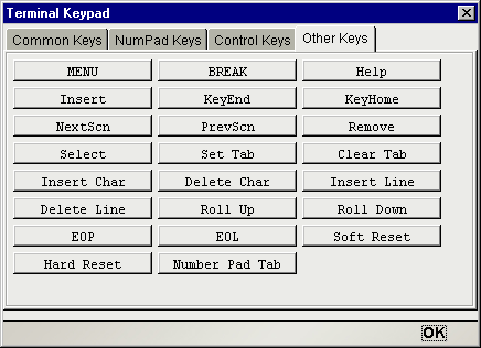 The Tandem Native Environment Pane supports the use of numerous special terminal keys. The Terminal Keypad dialog (see below) is comprised of four Tabs: Common Keys, NumPad Keys, Control Keys and Other Keys. Each Tab contains a group of keys with specific functionality.