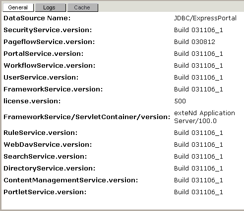 The General page displays information about your application. For example, it displays the datasource name for the database in which exteNd Director tables are stored, as well as the build numbers for the subsystems: