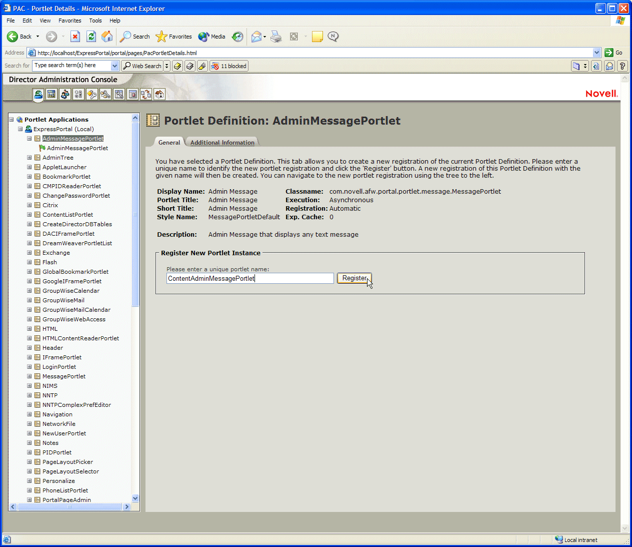 A General tab opens in the right content frame, displaying a panel at the bottom called Register New Portlet Instance: