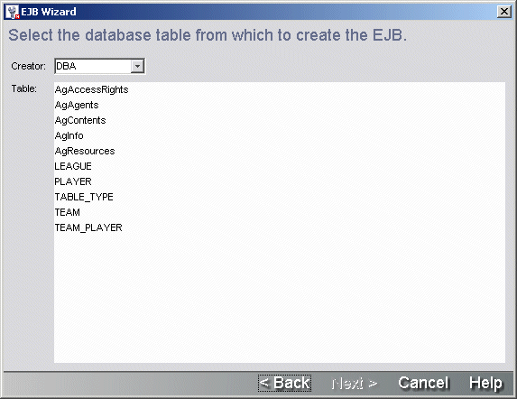 This panel presents a list of database tables. You can select the database table that you want to use as the basis for your entity bean.