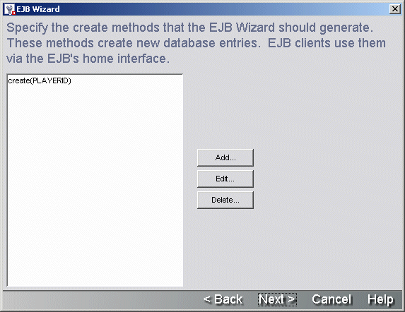 On this panel of the EJB Wizard, click Add and specify the details of one method at a time: