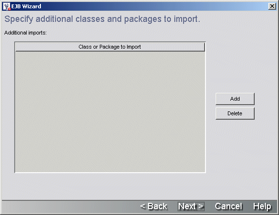 This panel is used to specify any other classes or packages you want the wizard to generate import statements for. The wizard does not import any packages by default.