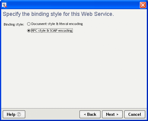 You can generate a Web Service from any one of the following: No matter which one you provide, it should (at minimum) declare the methods you want your generated Web Service to expose. Compile your Java files If you provide any Java files, make sure you compile them in your project before starting the Web Service Wizard (because the wizard works from compiled classes). Edit your WSDL bindings If you provide any WSDL files, edit them as needed to make sure the SOAP address in the service definition specifies the correct binding URL. The Web Service Wizard will use this URL in the files it generates for your Web Service. No overloaded methods Overloaded method names are not allowed in Web Service interfaces (as of WSDL 1.2). If you're generating from: |