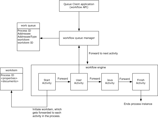 The queue persists workitems so they can be made available to workflow users. The queue stores workitem instances and data associated with them, such as the addressee (user) and the addressee type (user or security role). When the activity is completed, the queue manager tells the engine to forward the workitem to the next activity. System type activities that do not require user intervention (like Java activities) are not queued: They are executed in line by the workflow engine.