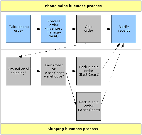 The figure below shows two business processes: one that models how an organization executes telephone sales orders and one that models the shipping process.