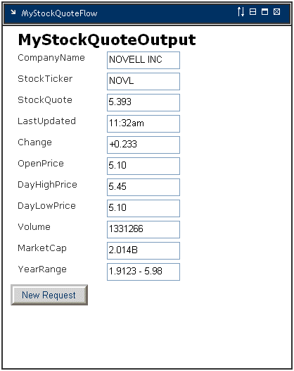 When the user submits the form, the service executes. Once the service has finished processing, the pageflow displays an output form that shows the data returned by the service: