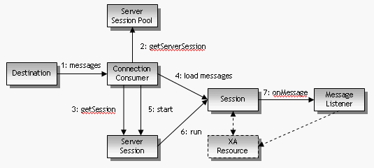 The graph below illustrates the relationship between a connection consumer, the server session pool and a session. Since a server session pool can create multiple sessions, which are run in different threads, this architecture allows messages to be dispatched concurrently using a single connection. If the session supports distributed transactions (XASession), the session's message listener can optionally involve an XAResource to transactionally dispatch messages.