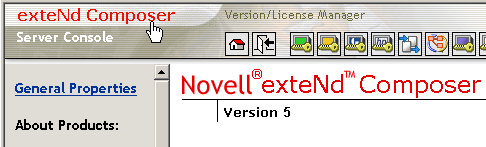 In the upper left corner of the console window, click the exteNd Composer logo immediately above the words "Server Console," as shown in the following illustration.