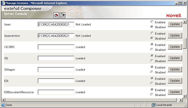 Type a license string in the text field in the "baanservice" row; then select Enabled in the "baanservice" row. To use the evaluation license string, just select Enabled.
