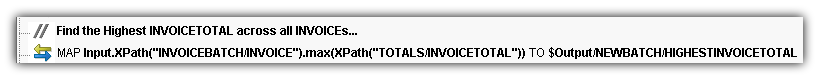 To find the maximum of an element across multiple INVOICEs, you can specify the "max" method in a Source specification. This establishes the context for the max() function. Then you can continue the specification down to the point of the DOM tree where the element you are interested in finding the max of resides "TOTALS.INVOICETOTAL."
