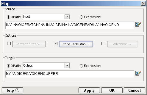 Mapping with Code Tables allows you to automatically transform one set of codes used in the Input Part into another set of codes used on the Output Part. In order for you to transform elements with Code Tables, you must have already created Code Tables and Code Table Maps.
