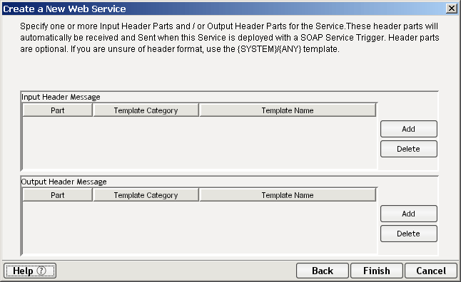 Using the methods described above for adding Input, Output, Temp and Fault Documents, specify Input and Output Header Parts for your service if it will be used with a SOAP Service Trigger.