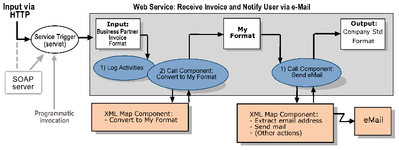 The service is invoked by its Service Trigger (an object created at deployment time, designed to start a service in response to some external event). The servlet can be started by a business partner's application server issuing an HTTP Post to the servlet; or, alternatively (as shown by the longer grey arrow), the servlet could be invoked programmatically by a Java process on the host server.