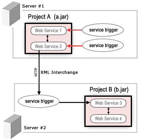 In this diagram, Web Service 2 in Project A wishes to call Web Service 3 in Project B. Although Web Service 2 can call Web Service 1 directly, since it resides in the same project JAR, it cannot reach Web Service 3 directly. Instead, it must execute an XML Interchange action, which fires the service trigger for the remote service.