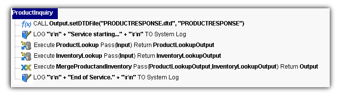 The third component action calls a component (MergeProductAndInventory). It passes the DOMs ProductLookupOutput and InventoryLookupOutput which the component receives data from the service as its Input and Input1 DOMs, and specifies a service DOM to receive the component's Output (Output).