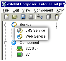 In exteNd, there are two types of services: Web Services, and JMS Services. (JMS stands for Java Messaging Service, a Sun-defined interface for message oriented middleware.) Your project, deployed (typically) as an EAR file, might contain one or more of either or both kinds of services. The two service types are referenced by two different icons under the "Service" heading of Composer's navigation frame (see below).