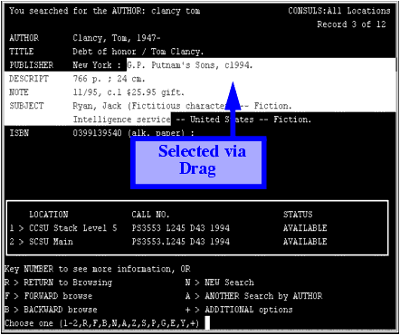The net result of these lines of ECMAScript is that the number preceding the book title in the target row (namely, `3') is supplied to the host application via a Send Buffer action. No newline need accompany the number `3'. Upon receiving this number, the host application will immediately send back a new screen giving detailed information about the indicated book, as shown below.