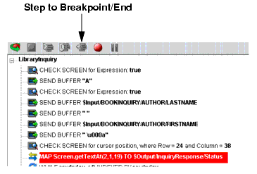 Click other buttons (Step Over, Run To Breakpoint, Pause, etc.) as desired to control the execution of the component. Note that you can set a breakpoint at any time during execution by clicking the mouse on an action line and hitting F2 or using the Set Breakpoint button.