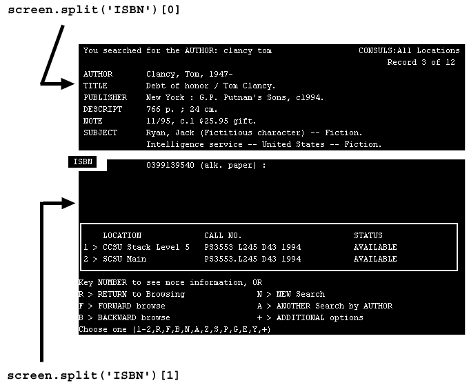 The third line checks the screen buffer to see if "ISBN" occurs in it. If so, we split the buffer into an array of substrings using "ISBN" as the delimiter. The array member at index 1 will contain the ISBN number, trailed by a partial screen's worth of information (and possibly containing one or more leading space characters). The custom ECMAScript function lTrim() is used to trimming leading spaces, while the split method is again employed to break our string into an array of substrings, assuming spaces to be the delimiters. The zeroth item of this final array is the ISBN string that we're looking for. See the series of graphics below.