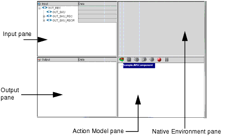 The JMS Component Editor is similar in appearance to the XML Map Component Editor window (and in fact includes all the functionality of the XML Map Component Editor, plus additional Action types specific to messaging). Like all other Component Editors, the JMS Component Editor window includes an Action Model pane (which is typically in the lower right corner, although it doesn't have to be), a Native Environment pane (upper right), and mapping panes for input, output, and/or temporary DOMs.
