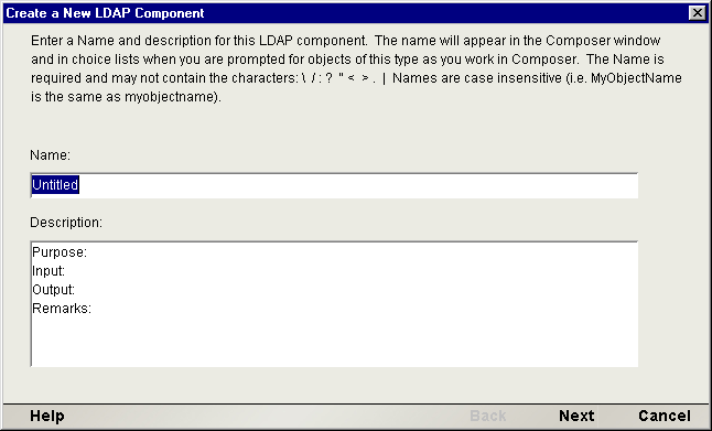 As with all exteNd components, the first step in creating a new LDAP component is to determine whether you need any XML templates. (For more information, see Creating a New XML Template in the separate Composer User's Guide.) Providing you've created a Connection Resource in advance (discussed earlier), you can then create an LDAP Component, using your templates' sample documents to represent the inputs and outputs processed by your component.