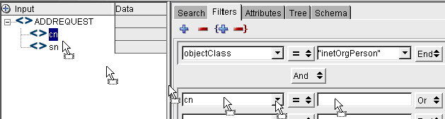 In this example, the user is constructing a search filter and is taking advantage of drag-and-drop to bind a node in the Input document to a parameter in the filter expression. The user has clicked the cn node under ADDREQUEST in Input, and dragged it to the empty field in the Native Environment Pane. When the mouse is released, the appropriate ECMAScript expression, namely Input.XPath("ADDREQUEST/sn"), will appear in the target field of the search expression. Thus, the filter (as constructed) will match entries where objectClass equals inetOrgPerson and sn equals the value in Input/ADDREQUEST/sn.