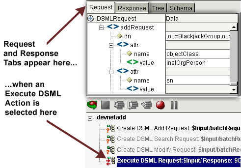Two special tabsthe Request and Response tabsappear in the Native Environment Pane when an Execute DSML Action is selected (highlighted) in the action-model pane. These tabs (see below) present a tree view of the DSML request/response DOMs that were used by the Execute DSML action during execution.