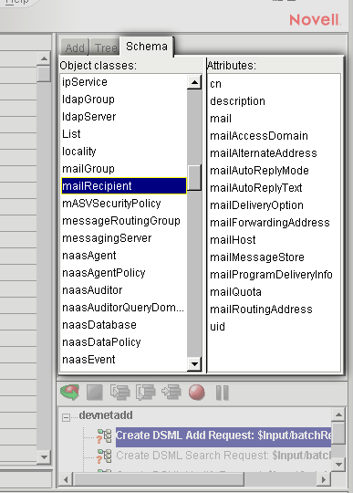 The Schema tab (see illustration below) is a read-only design-time aid for inspecting object/attribute relationships as defined by the schema for this particular tree. If your component will contain actions that modify the schema, you can verify the changes visually simply by inspecting this tab. ( "Schema" here refers to the directory schema, not an XML schema.)